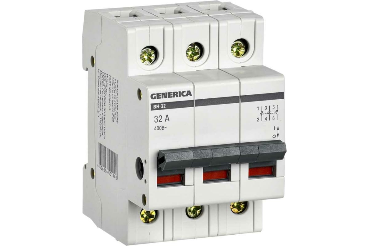 Выключатель нагрузки (мини-рубильник) IEK ВН-32 3Р 32А GENERICA MNV15-3-032 служит для включения, проведения и отключения номинального тока в нормальных условиях эксплуатации, проведения тока в аварийных режимах, например, при коротком замыкании, а также для выполнения функций разъединения