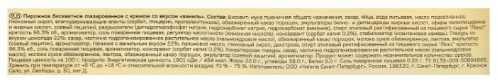 • Состав бисквит: мука пшеничная общего назначения, сахар, яйца, вода питьевая, масло подсолнечное, глюкозный сироп, влагоудерживающие агенты (сорбит, глицерин, пропиленгликоль), обезжиренный какао порошок, эмульгаторы (моно- и диглицериды жирных кислот, эфиры полиглицерина и жирных кислот, cоевый лецитин), разрыхлители (дигидропирофосфат натрия, гидрокарбонат натрия, гидрокарбонат аммония), спирт этиловый ректификованный из пищевого сырья "Люкс" крепость 96,3% об., ароматизатор, соль поваренная пищевая, регулятор кислотности (лимонная кислота), консервант (сорбат калия 0,2%), стабилизатор (ксантановая камедь).Глазурь со вкусом шоколада 22%: сахар, частично гидрогенизированное растительное масло (пальмоядровое масло), обезжиренный какао порошок, молоко сухое обезжиренное, лактоза, эмульгатор (соевый лецитин), ароматизатор.Начинка с ванильным вкусом 22%: пальмовое масло, глюкозный сироп, декстроза, спирт этиловый ректификованный из пищевого сырья "Люкс" крепость 96,3% об., соль поваренная пищевая, ароматизатор, консервант (сорбат калия 0,2%).Кондитерская глазурь: сахар, частично гидрогенизированное растительное масло (пальмоядровое масло), молоко сухое обезжиренное, лактоза, обезжиренный какао порошок, эмульгатор (соевый лецитин), ароматизатор. Продукт может содержать незначительное количество орехов