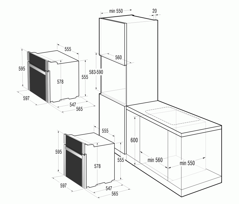 - Размеры для встраивания (ВхШхГ) 590х560х550 мм