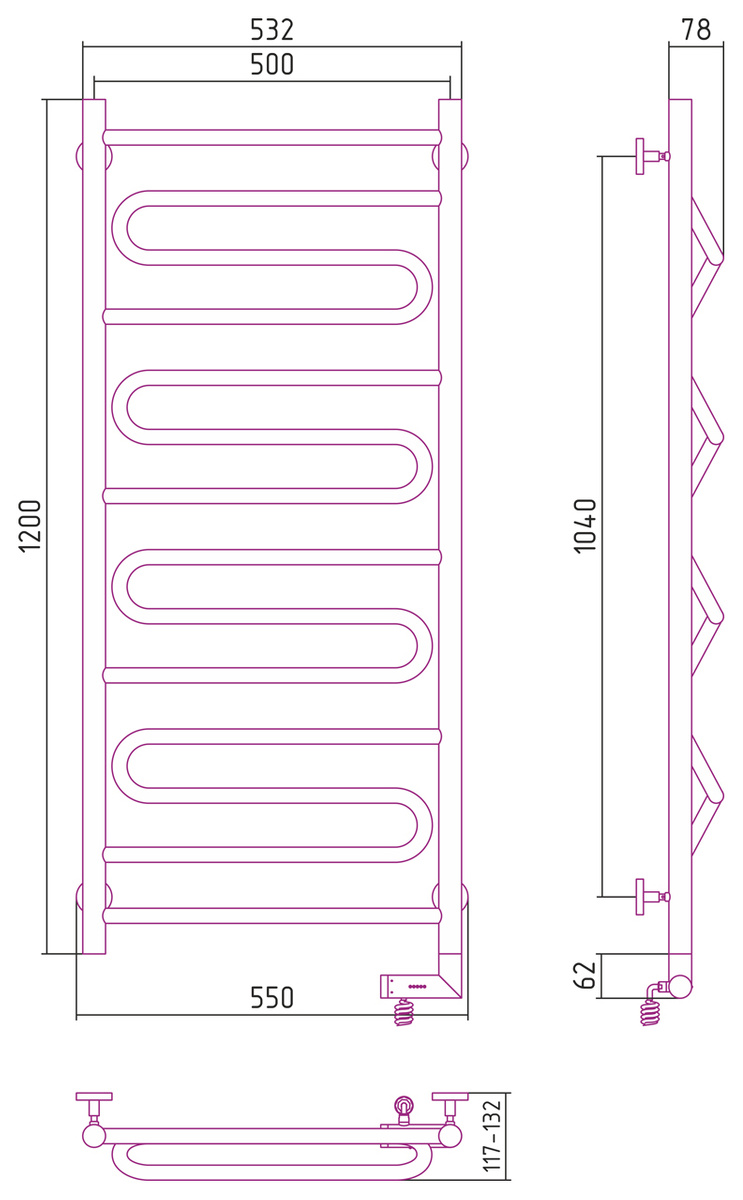 Полотенцесушитель электрический Сунержа Элегия 2.0 1200х500 с блоком управления справа ЗОЛОТО, 03-5219-1250