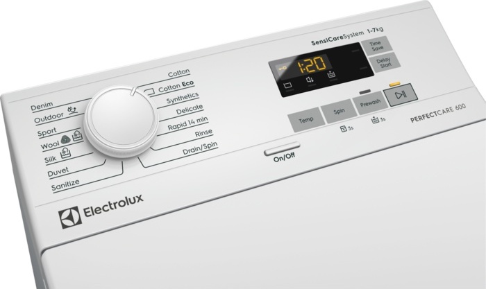 Отдельно стоящая стиральная машина, барабанного типа, вертикальная загрузка, 6 кг, количество программ 14, класс энергопотребления A+++, отложенный старт, индикация ошибок, защита от детей, ширина 40 см.