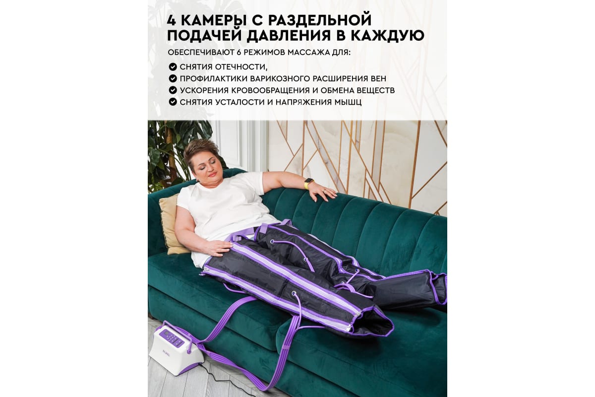 Манжеты с 4мя воздушными камерами в каждой обеспечивают устойчивый лимфодренажный эффект: для уменьшения отёчности в ногах и руках, снятия усталости, улучшения кровообращения, а также борьбы с целлюлитом.