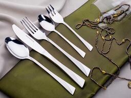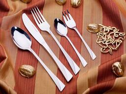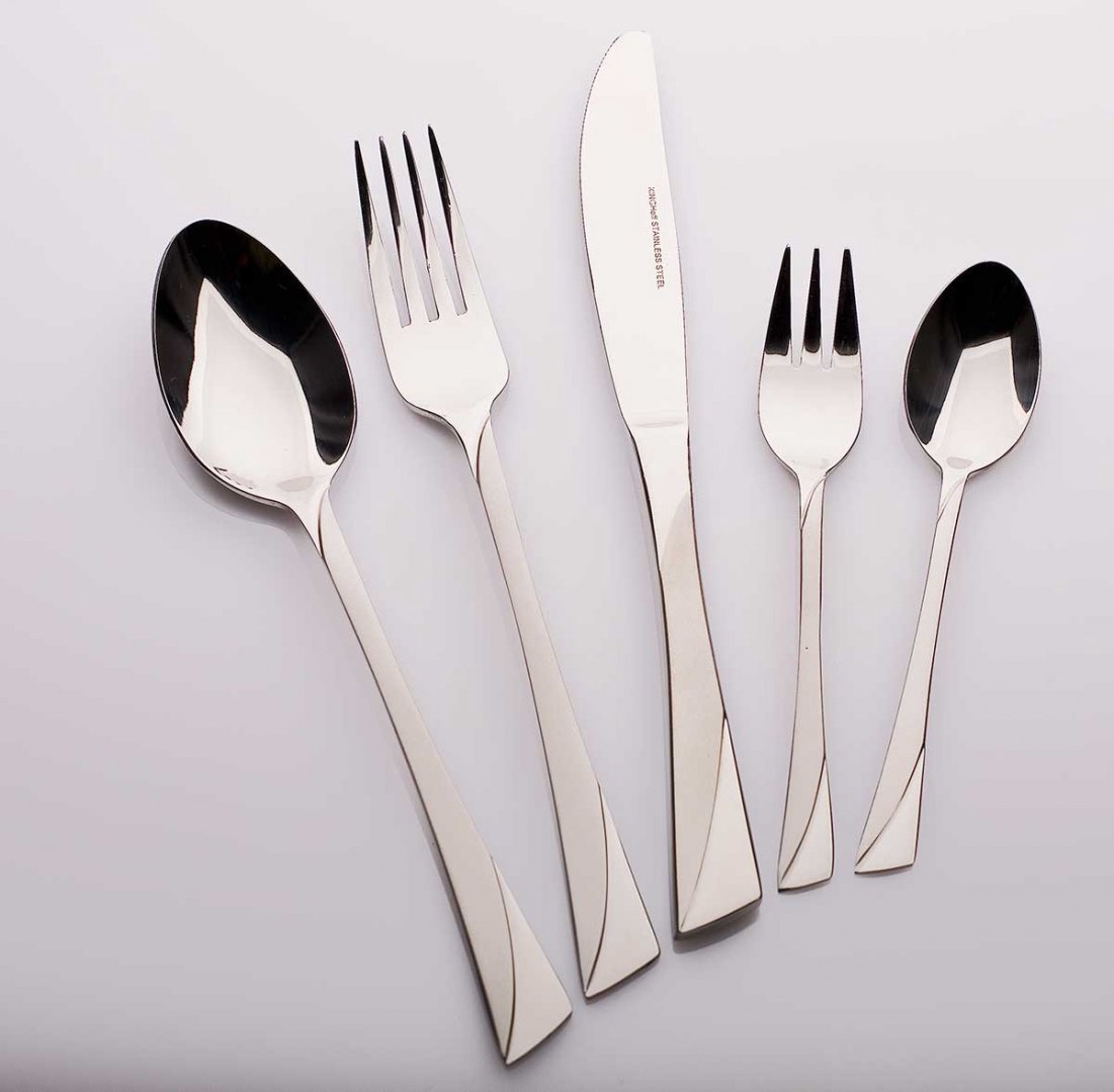 - Komplekte 12 peilių, 12 šakučių, 12 šaukštų, 12 arbatinių šaukštelių, 12 desertinių šakučių, 2 mėsos šakutės, 2 šėrimo šaukštai, cukrinis šaukštas, grietinėlės šaukštas, salotų šaukštas, salotų šakutė, sriubos šaukštas, padažo šaukštas, torto mentelė, cukraus žnyplės
