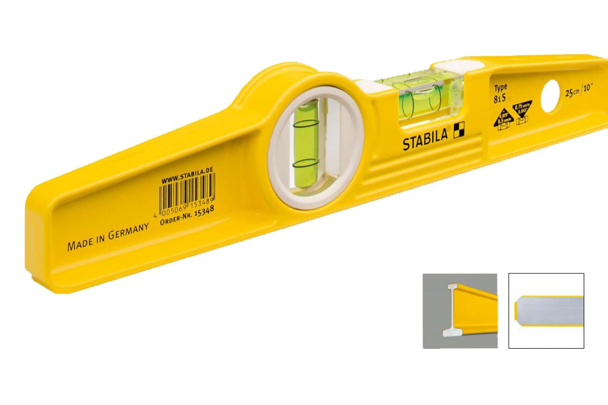 Уровень STABILA тип 81S, 25 см 02500 полезен в быту. Используется для проверки поверхностей на отклонения от горизонтали и вертикали. Имеет литой корпус из металла, отличающийся стойкостью к сильным ударам. Данный уровень пригоден для измерения над головой. Размер всего 25 см - удобен для работы в стесненных условиях.