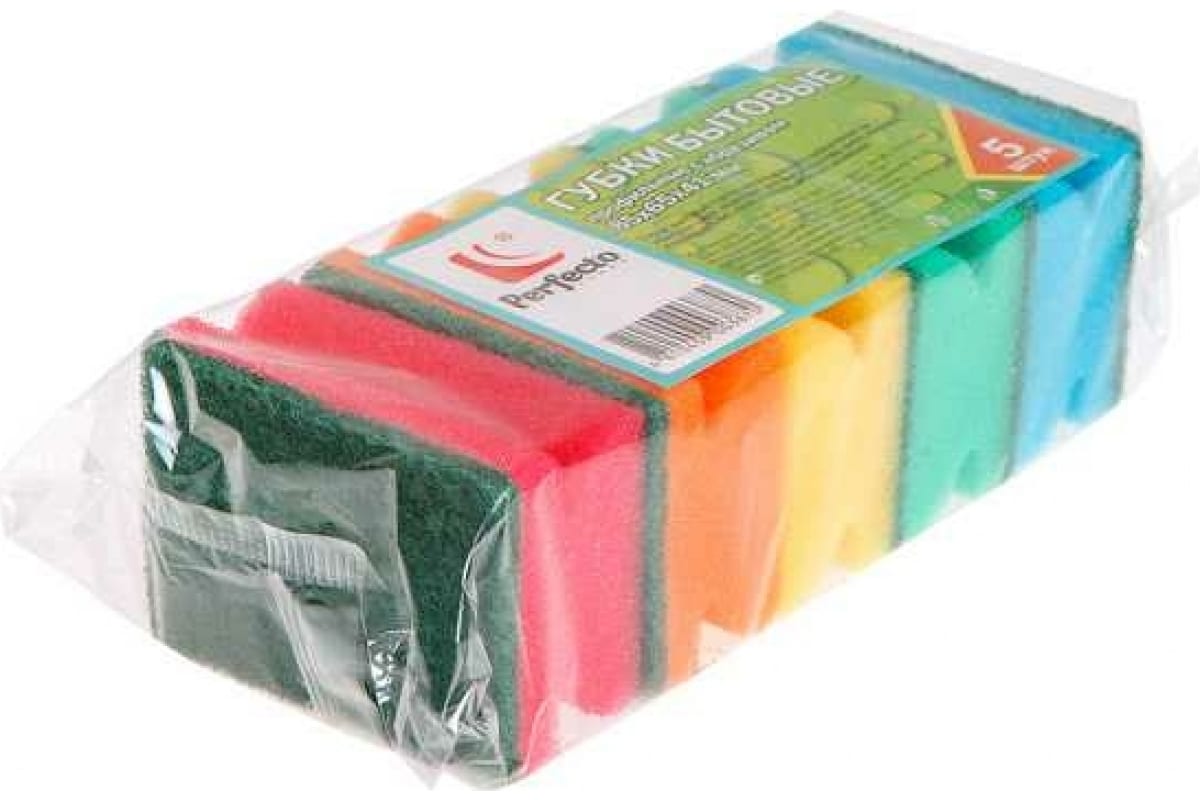 Бытовые губки PERFECTO LINEA 5 штук 45-850250 многоцелевого назначения, подходят для мытья посуды, ванн, раковин, кухонных плит, окон, кафеля.