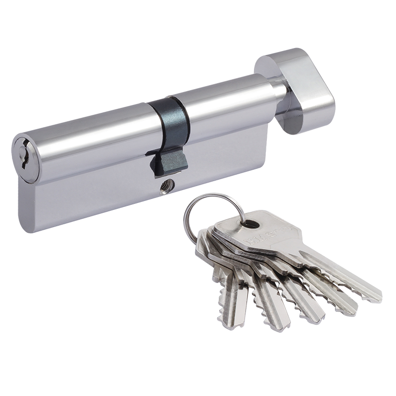 Цилиндр для межкомнатных и входных дверей. Материал ЦАМ (сплав цинка, алюминия и меди). В комплекте 5 стальных английских ключей. 5 пинов. Цилиндр имеет вертушку для удобного запирания изнутри помещения без использования ключа. Длину цилиндра подбирайте исходя из толщины двери, с небольшим запасом под накладку. Гарантия на работу цилиндра 1 год.