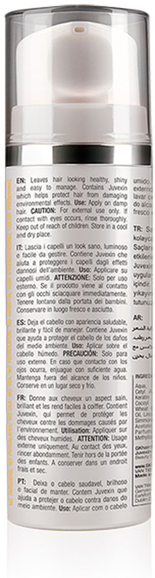 - Состав: Аминокислоты Коллагена (придают волосам блеск, создают коллагеновый (защитный) слой на поверхности волос, пролонгируют действие экстрактов и масел в составе спрея), Масло зародышей пшеницы(содержит витамины А, Е, F, В, фосфолипиды, гликолипиды, полинасыщенные жирные кислоты, селен, железо, цинк, является натуральным антиоксидантом, замедляющим процесс старения), Масло Жожоба (богато аминокислотами, минералами и множеством витаминов, насыщает и питает волосяные фолликулы, сохраняя влагу внутри нормализует работу сальных желез, покрывает волосы невидимым защитным слоем, предотвращая негативное воздействие внешних факторов), Пантенол (нормализует работу волосяных фолликул, увеличивает плотность структуры волоса), Кератин Juvexin (глубоко питает, служит восстанавливающим и тонизирующим средством)