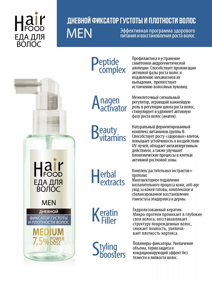 - Способ применения: Распылить продукт на влажные волосы попрядно в прикорневую зону. Следует высушить волосы феном и уложить желаемым образом. Для достижения наилучшего результата используйте комплексный уход по следующей схеме: УТРОМ ежедневно - «Сыворотка активатор роста MEN» - для стимуляции роста новых волос и удлинения активной фазы роста волос; УТРОМ/ДНЕМ - «Дневной Фиксатор MEN» - при необходимости создания прикорневого объема и интенсивного питания волос; ВЕЧЕРОМ ежедневно - «Ночной Интенсив комплекс питание для волос MEN NIGHT Therapy» - для укрепления луковиц волос, ре-запуска роста новых волос. Продолжительность курса должна составлять не менее 3 месяцев, и не более 6 месяцев (далее 1 месяц перерыв). Не менее 3 таких курсов, после чего (при достижении устойчивого эффекта) сделать перерыв на 2-3 месяца.