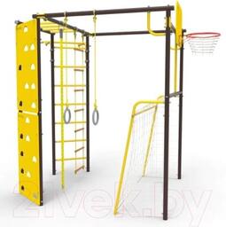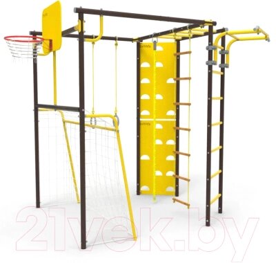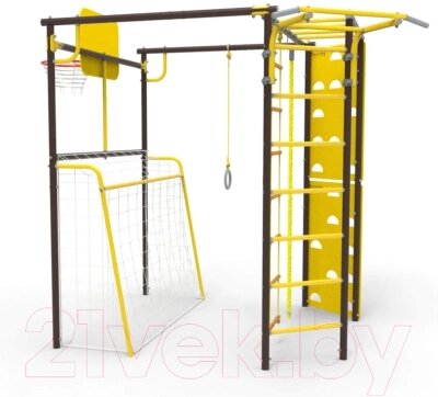 • Элементы комплекса в комплекте турник, канат, кольца, рукоход, футбольные ворота, стена для лазания, веревочная лестница, баскетбольная корзина