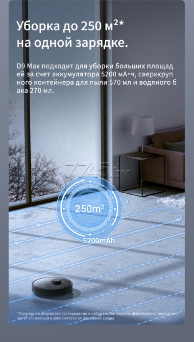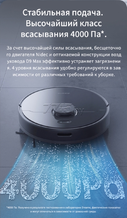 Робот-пылесос DREAME Robot Vacuum D9 Max (RLS5-BL1) эффективно устраняет загрязнения. 4 уровня всасывания удобно регулируются в зависимости от различных требований к уборке. Удлиненная основная щетка и вращающаяся V-образная щетка позволяют захватывать мелкие частицы пыли в глубоких щелях и ковре. Прибор автоматически увеличивает силу всасывания до максимальной при обнаружении ковров. За счет технологии лазерной навигации со сканированием в 360⁰ пылесос создает редактируемую карту этажей дома уже при первом рабочем сеансе. Кроме того, уборка выполняется методично, а не хаотично от стены к стене. Робот-пылесос удаляет пыль и въевшиеся пятна. Вам больше не нужно беспокоиться о качестве уборки благодаря сменной швабре из микрофибры и 3 уровням подачи воды, регулируемых в приложении.