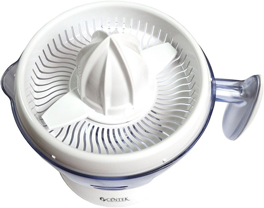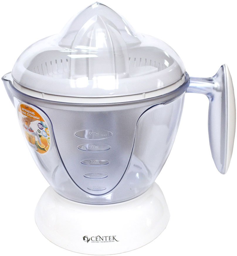 Соковыжималка для цитрусовых мощностью 40 Вт. Резервуар для сока объемом 1.2 л. 2 конусные насадки. Вращение в обе стороны. Отсек для хранения шнура с фиксатором штекера. Открытая нескользящая ручка. Защитная крышка.