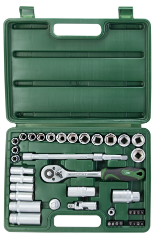 Комплект из слесарных инструментов для ремонта авто в количестве 39 штук включает насадки, биты, воротки и другие инструменты, выполненные из качественной хром-ванадиевой стали с дальнейшим антикоррозийным покрытием. Размер присоединительного квадрата составляет 3/8 дюйма.