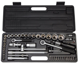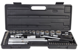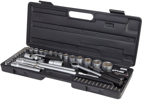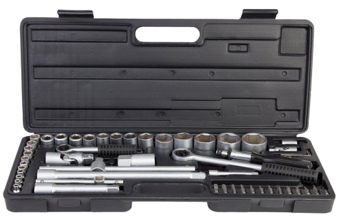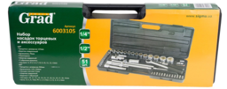 Качественный набор от Grad состоит из 51 компонента и поставляется в удобном пластиковом кейсе. Инструменты выполнены из хром-ванадиевой стали, предусматривают присоединительный квадрат на 1/2 и 1/4 дюйма. Комплект включает обычные насадки и свечные, удлинители, Т-образный вороток, переходники, карданные шарниры и др.