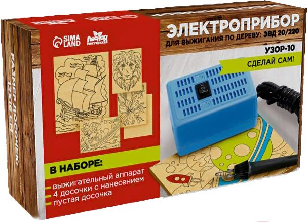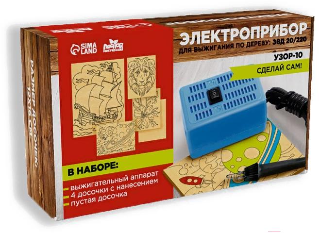 - Комплектация набора выжигательный аппарат, досочки с нанесением (4 шт.), досочка без рисунка (1 шт.)