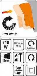 Дриль має потужний електродвигун потужністю 710 Вт, який дозволяє легко свердлити навіть найтвердіші матеріали. Для зручності роботи інструмент оснащений реверсом та електронним регулюванням швидкості.