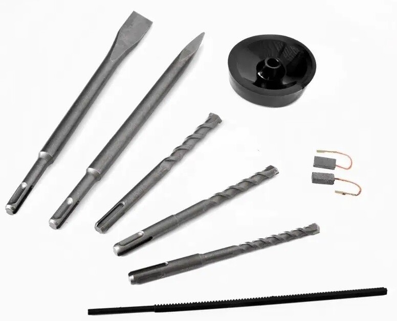 У комплект входять кілька свердлів та долот, що дозволяє використовувати перфоратор HECHT1080 для широкого спектру завдань, від свердління отворів до довбання канавок та отворів для проводів.