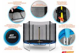 Для обеспечения безопасности пружины закрыты защитным чехлом. Внешняя защитная сетка (в комплекте) обеспечит безопасность от случайного падения. Сетка изготовлена из высокопрочного нейлона, надежно крепится к стойкам батута. Для защиты вход/выход через сетку выполнен на молнии с фиксирующими защелками с внешней стороны.