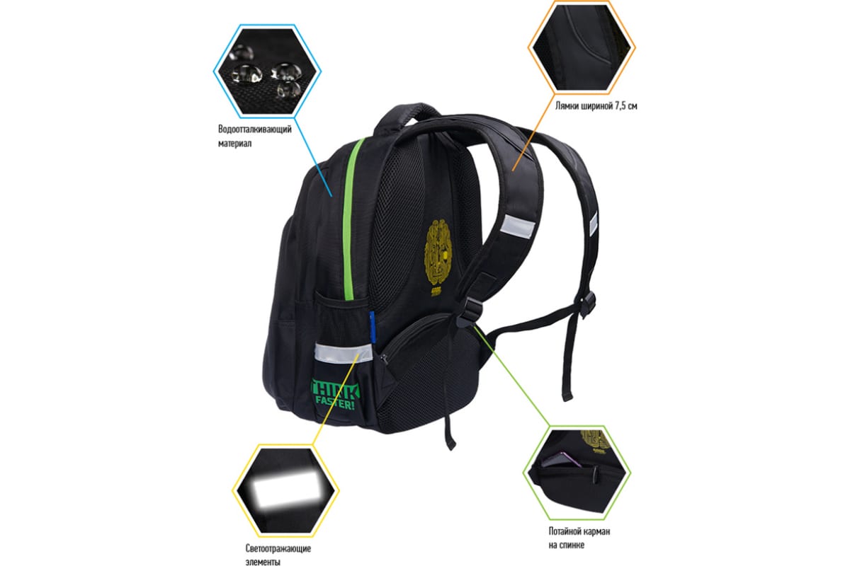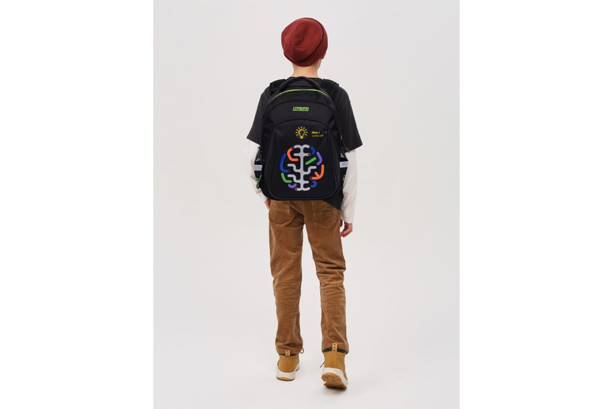 Удобное хранение учебных принадлежностей обеспечивают внутренний органайзер, отделение для учебных пособий и карман на молнии.