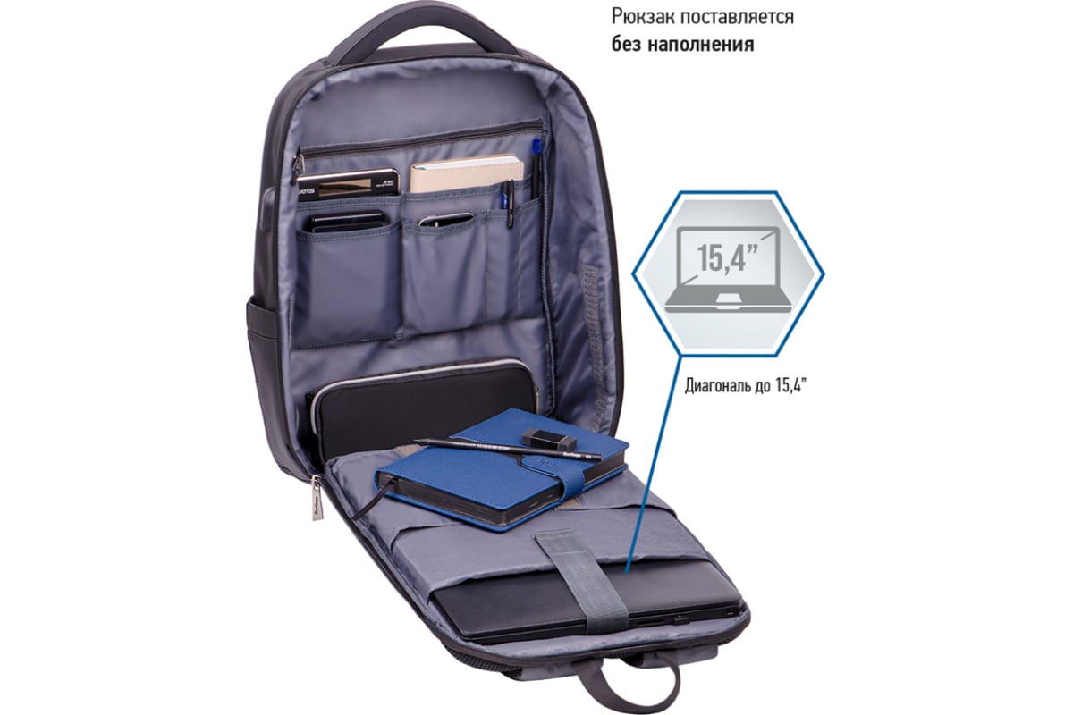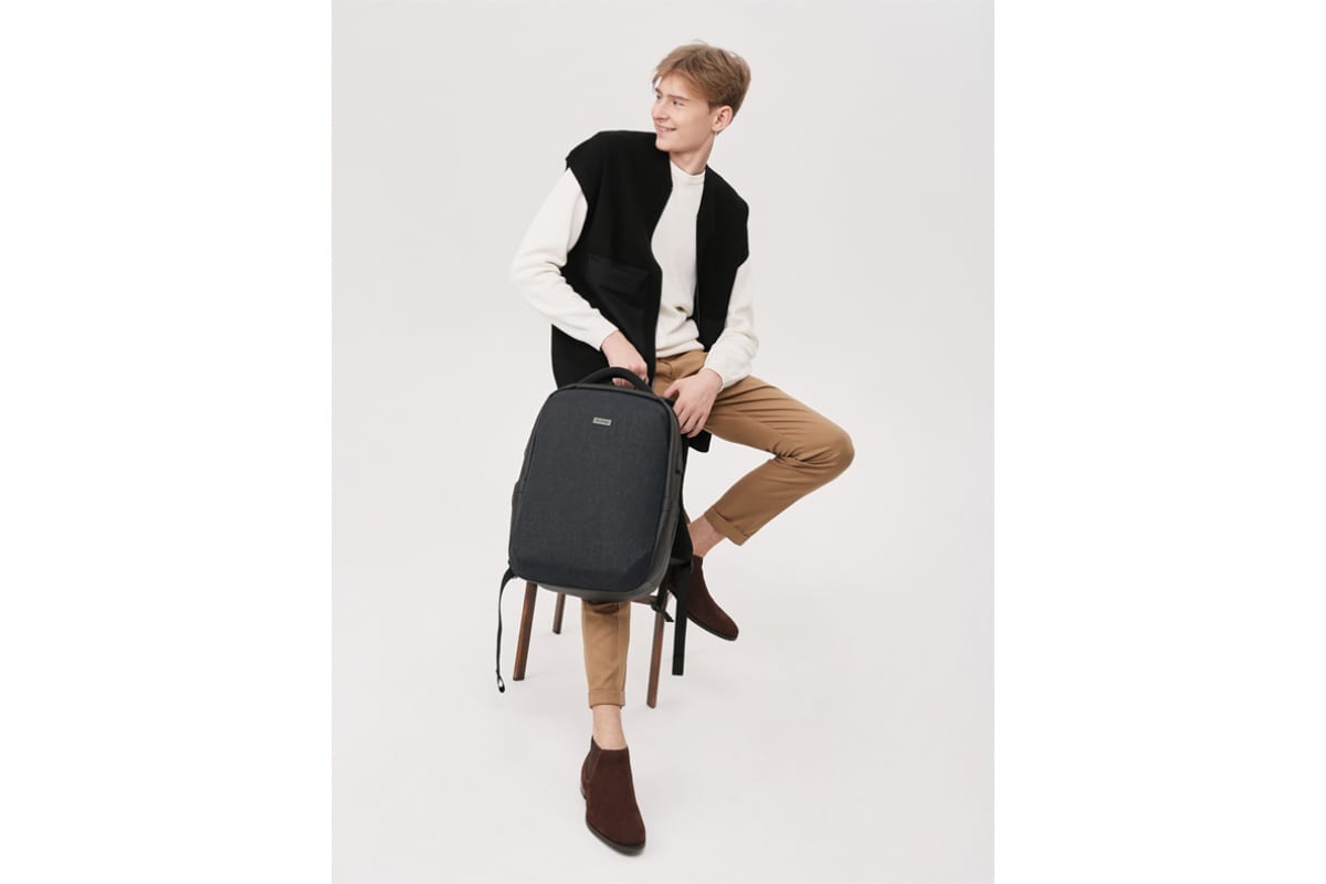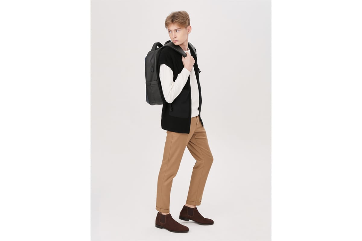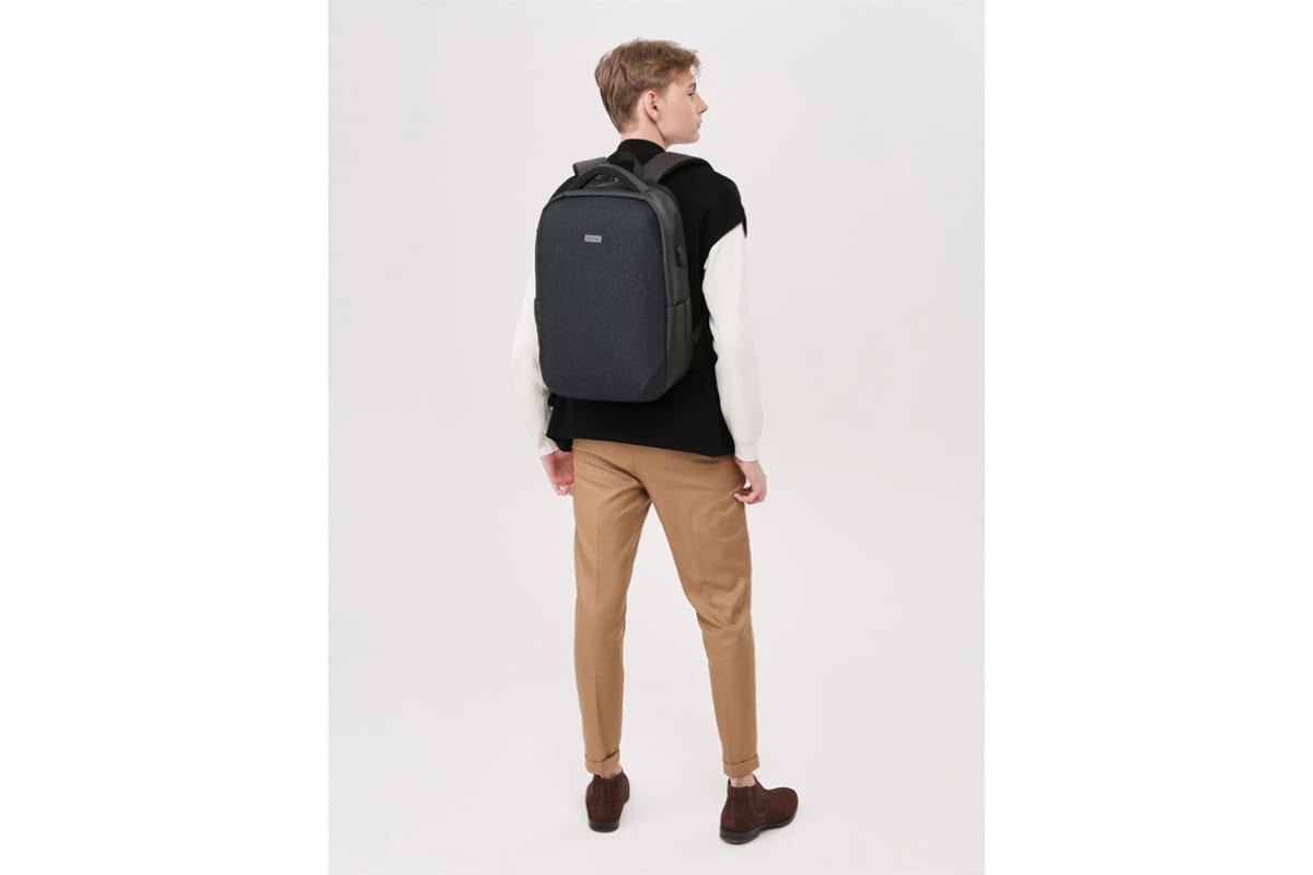 Имеет 1 отделение, 2 боковых кармана, 1 скрытый на спинке. Внутри основного отделения - карман для ноутбука, 4 небольших кармана, 1 на молнии и выход для USB устройства.