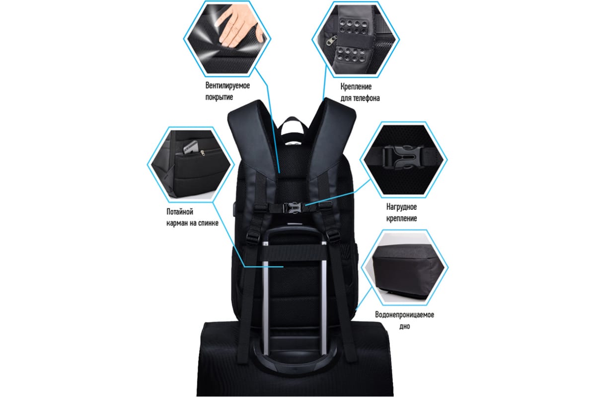 Оснащен эргономичной вентилируемой спинкой, регулируемыми лямками, ручкой для носки, лямкой для крепления на чемодан.