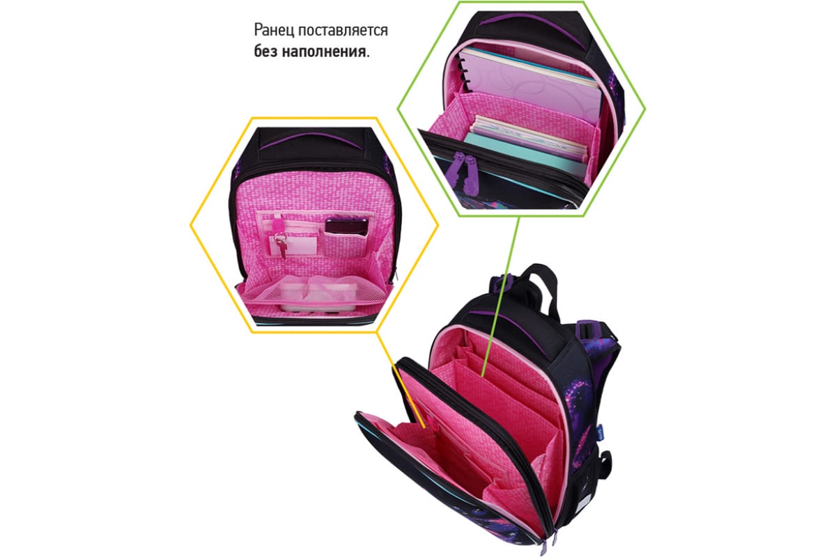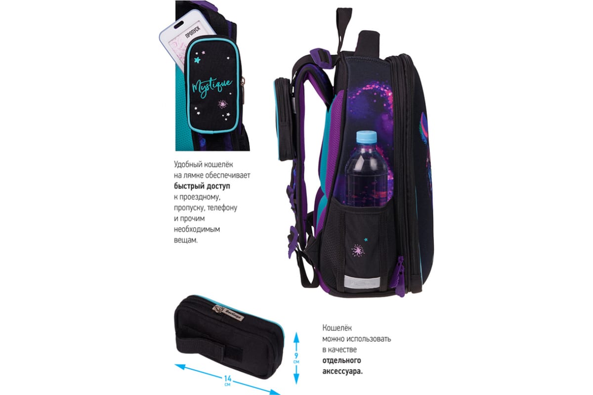 Внутри предусмотрены разделители для учебных пособий, органайзер для письменных принадлежностей, карман для мобильного телефона, карабин для ключей и именная карточка для подписи.