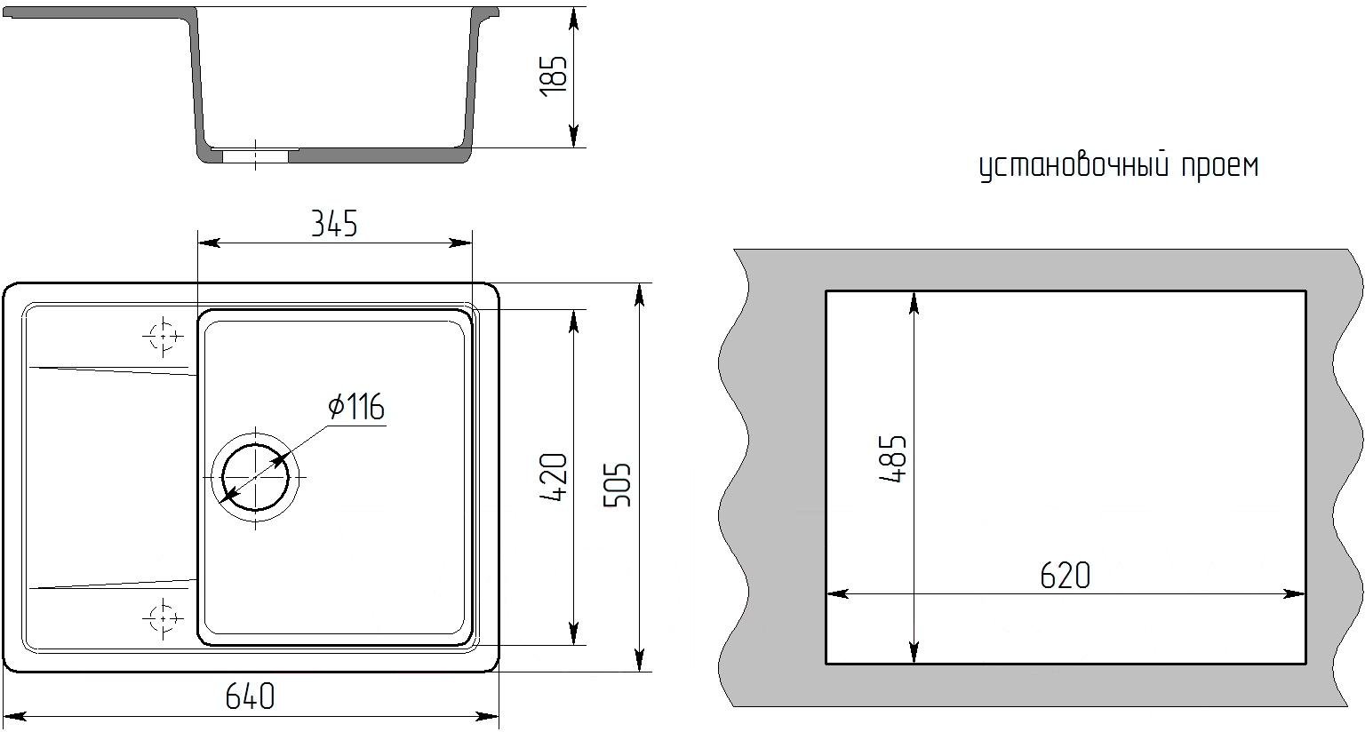 - Длина мойки (слева направо), см 64