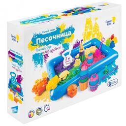 В наборе: зеленый песок 400 г, розовый песок 400 г, голубой песок 400 г, фиолетовый песок 400 г, натуральный песок 400 г, 2 формочки морских обитателей, 4 формочки для строительства замков, 2 штампика, 4 формочки кексиков, лопатка, стек, песочница.