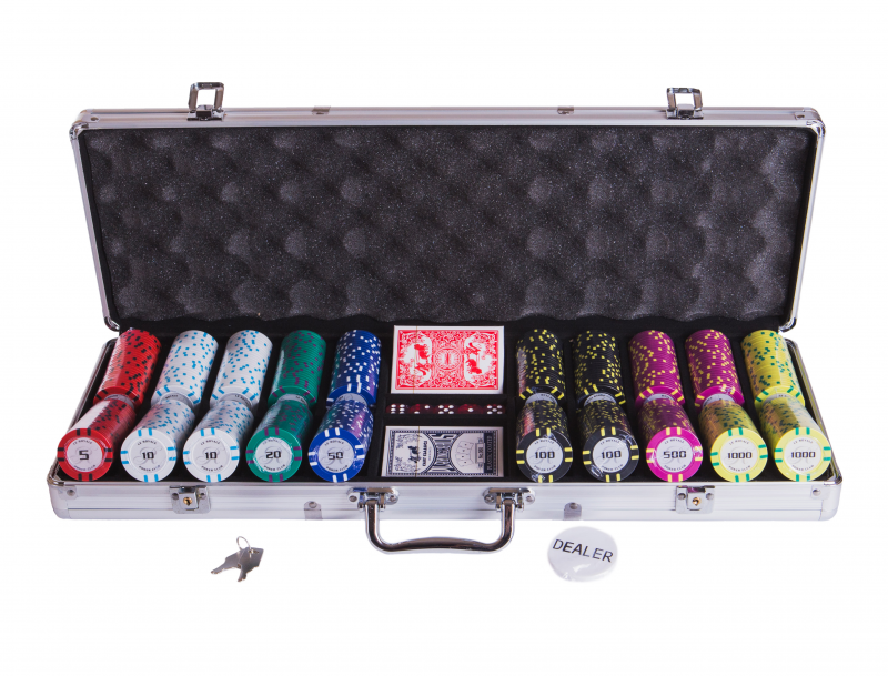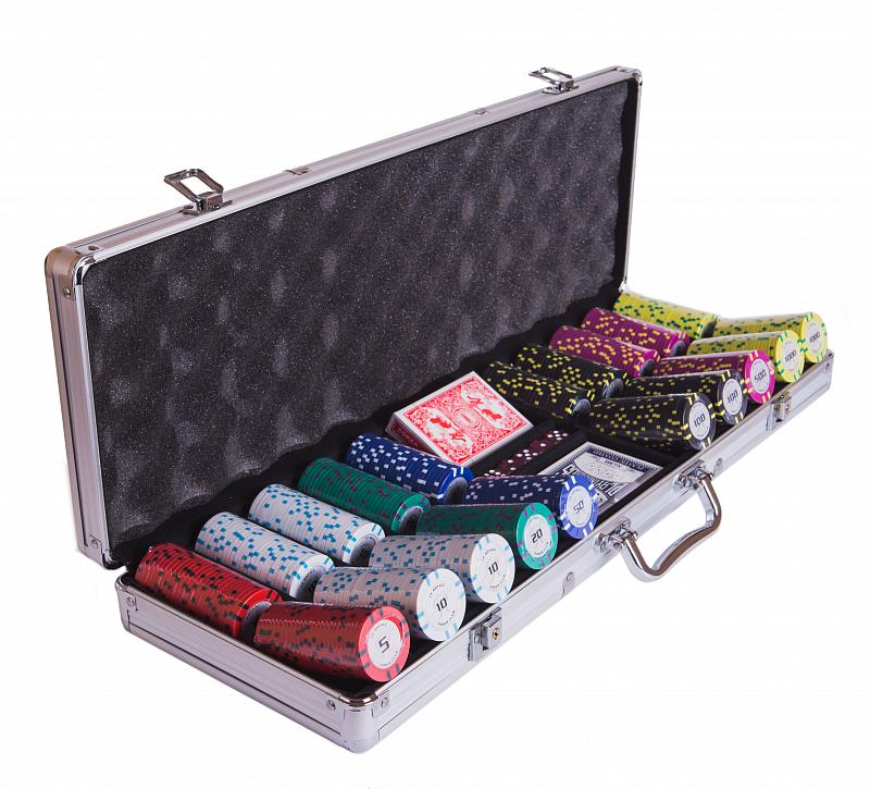 - Комплектация металлический кейс, 5-50шт, 10-100шт, 20-50шт, 50-50шт, 100-100шт, 500-75шт, 1000-75шт, 11,5, Фишка диллера, 2 колоды по 54 листа, 5шт