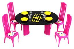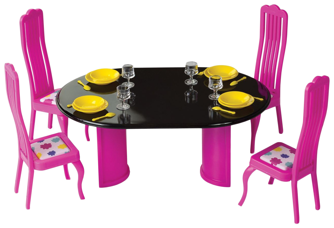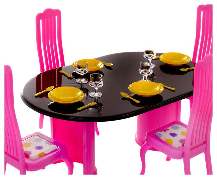 - Состав набора наборы посуды: 4 фужера, 4 тарелки, 4 мелких тарелки, 4 ложки, 4 вилки, графин; стол; стулья 4 шт