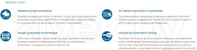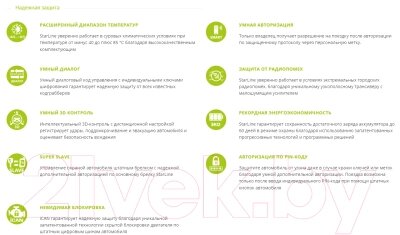 Дополнительные функциибесшумная постановка на охрану, дистанционное отпирание багажника, мобильное приложение, сервисный режим работы системы, блокировка замков, автопостановка на охрану, защита PIN-кодом, "Валет", поиск автомобиля, режим "Slave", охрана при работающем двигателе, "свободные руки", управление отопителями