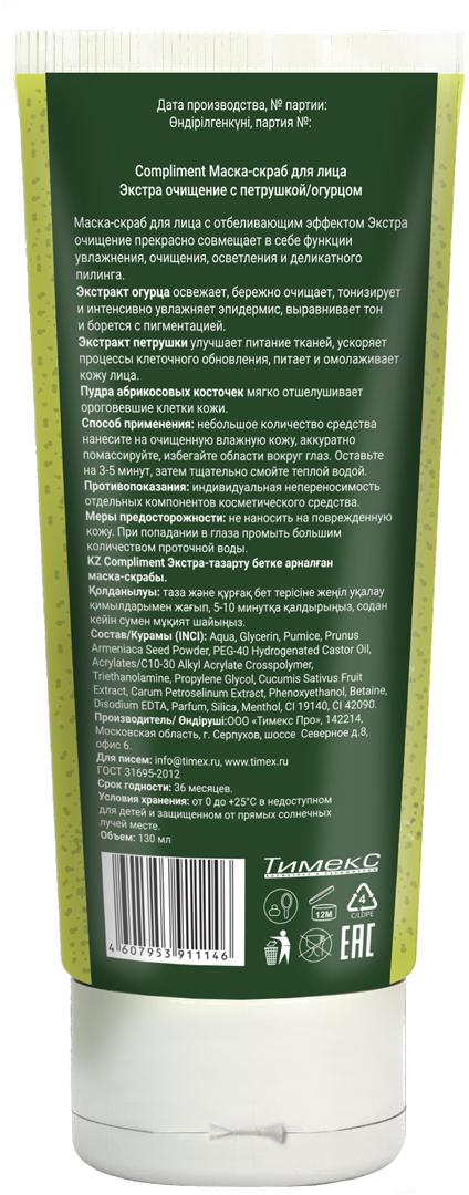 - Активные ингредиенты косточки абрикоса (пудра), экстракт огурца, экстракт петрушки