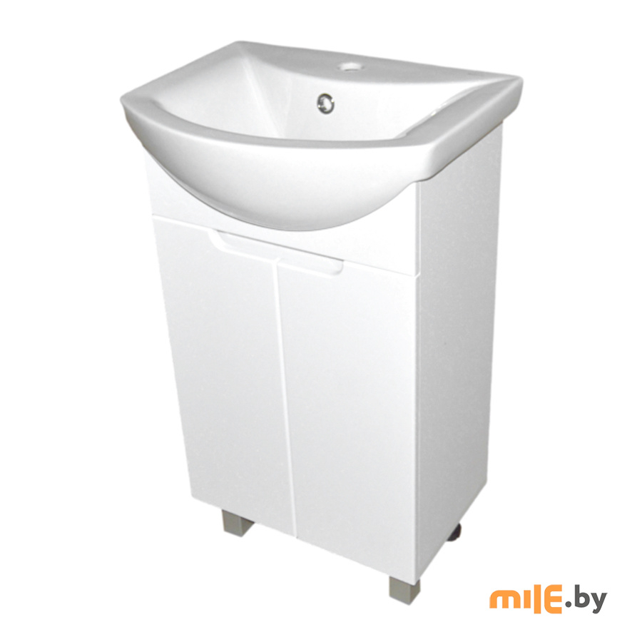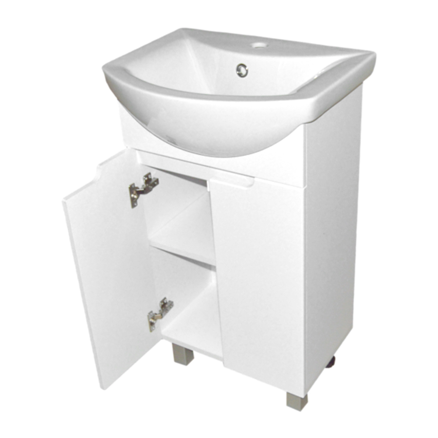 Корпус изделия изготовлен из ламинированного ДСП 16 мм, облицован кромкой ПВХ 0,4 мм, фасад МДФ. В комплекте умывальник производства Керамин (Беларусь).
