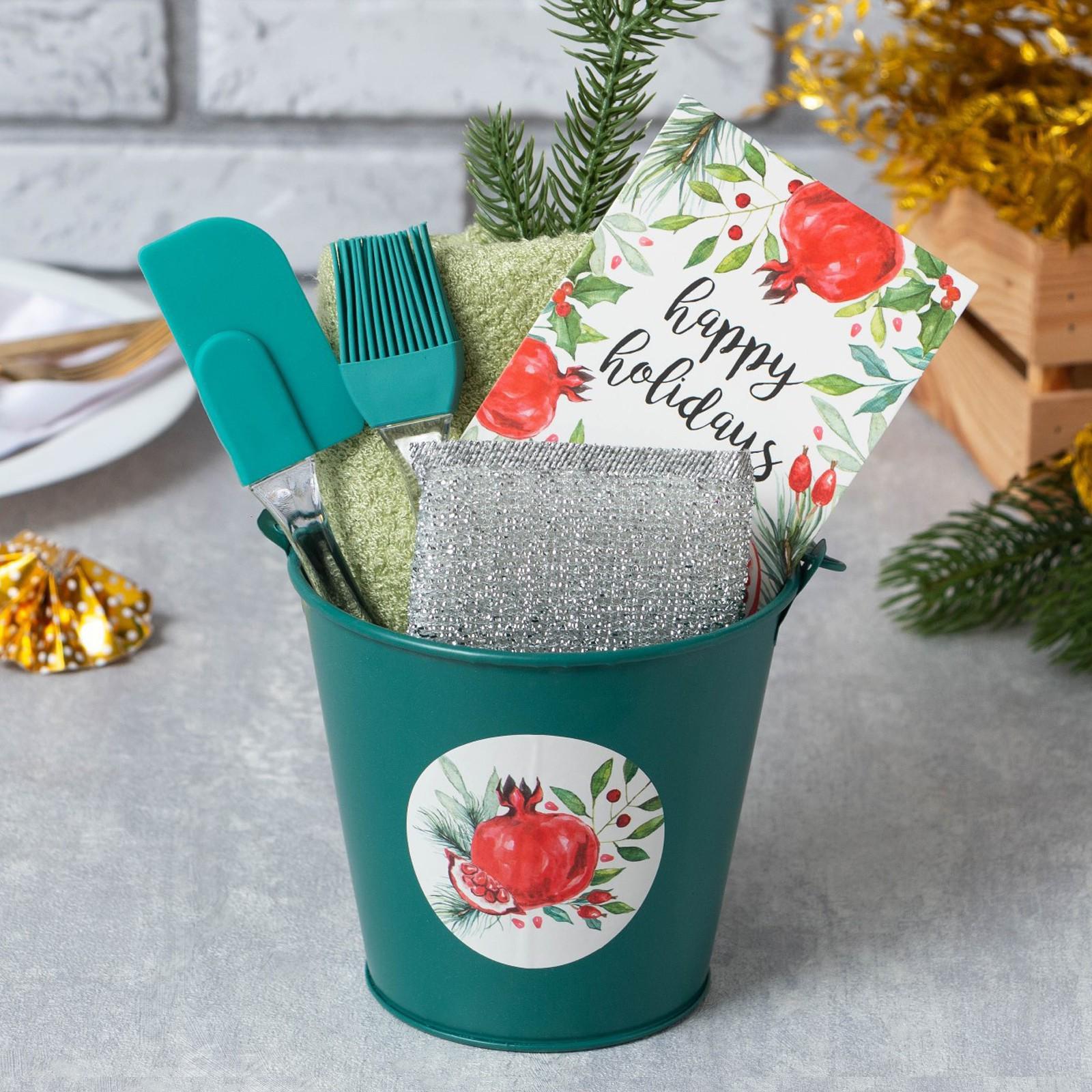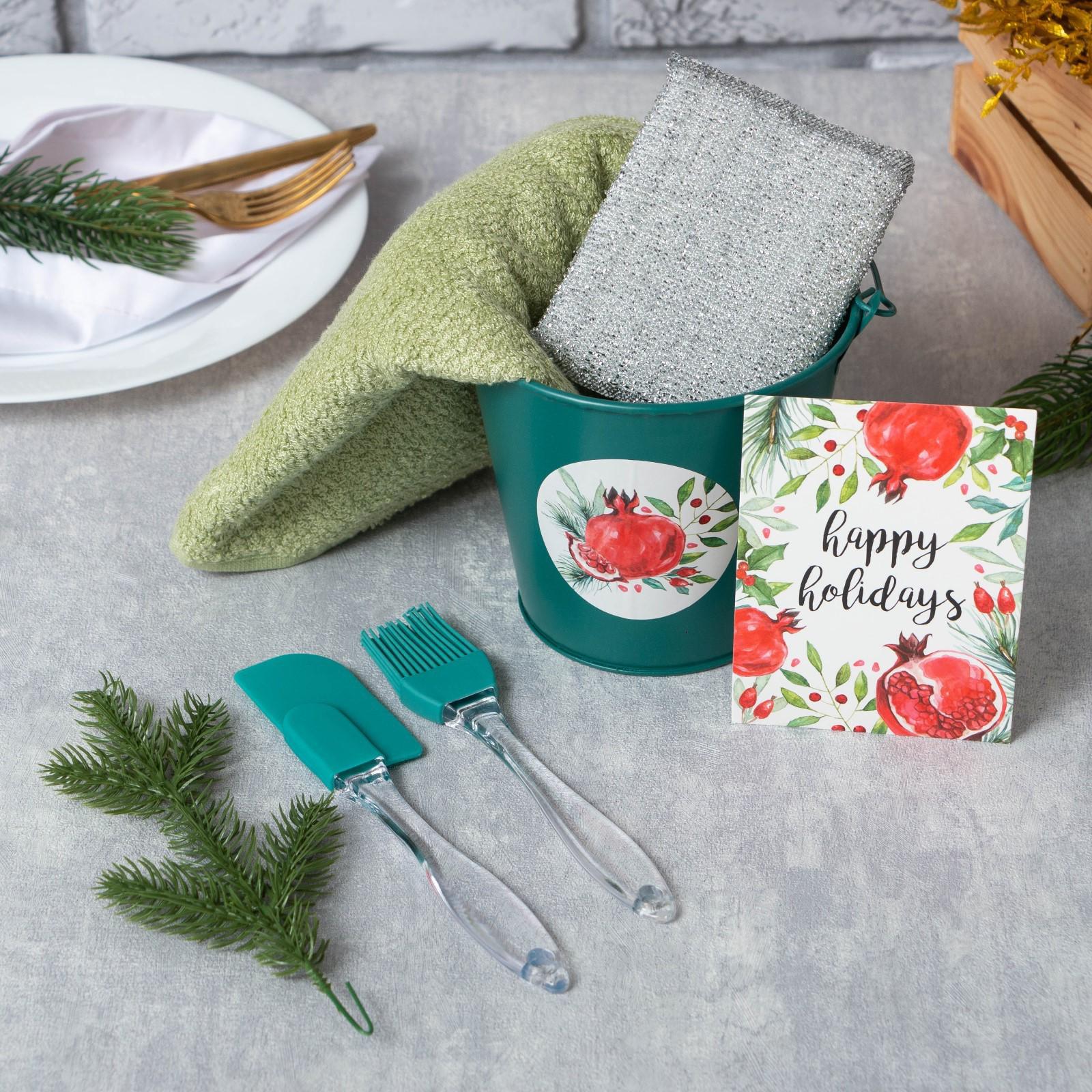 • Составляющие набора Ведро, Губка для мытья посуды, Кулинарная кисть, Кухонная лопатка, Открытка, Полотенце