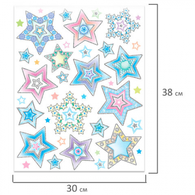 Изделие с изображением цветных звезд и снежинок представляет собой наклейку на окно/стекло, изготовленную из поливинилхлорида (ПВХ). Наклейка размером 30x38 см декорирована серебристым глиттером. Украшение предназначено для декорирования окон, зеркал, стекол и других ламинированных глянцевых поверхностей. Не оставляет клеевых следов и предназначено для многократного использования. Крепится к поверхности посредством статического эффекта. Украшение на белой картонной подложке упаковано в прозрачный полипропиленовый пакет на картонном подвесе.