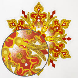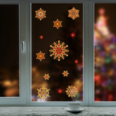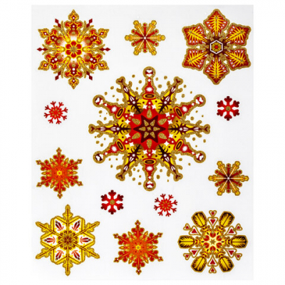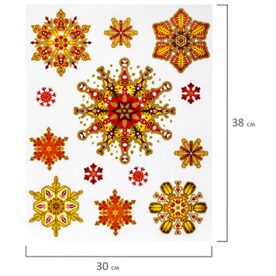 Изделие с изображением красно-золотых снежинок представляет собой наклейку, изготовленную из поливинилхлорида (ПВХ). Наклейка размером 30x38 см декорирована золотистым глиттером. Украшение предназначено для декорирования окон, зеркал, стекол и других ламинированных глянцевых поверхностей. Не оставляет клеевых следов и предназначено для многократного использования. Крепится к поверхности посредством статического эффекта. Украшение на белой картонной подложке упаковано в прозрачный полипропиленовый пакет на картонном подвесе.