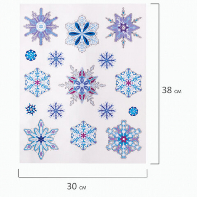 Изделие с изображением сине-голубых снежинок представляет собой наклейку, изготовленную из поливинилхлорида (ПВХ). Наклейка размером 30x38 см декорирована серебристым глиттером. Украшение предназначено для декорирования окон, зеркал, стекол и других ламинированных глянцевых поверхностей. Не оставляет клеевых следов и предназначено для многократного использования. Крепится к поверхности посредством статического эффекта. Украшение на белой картонной подложке упаковано в прозрачный полипропиленовый пакет на картонном подвесе.