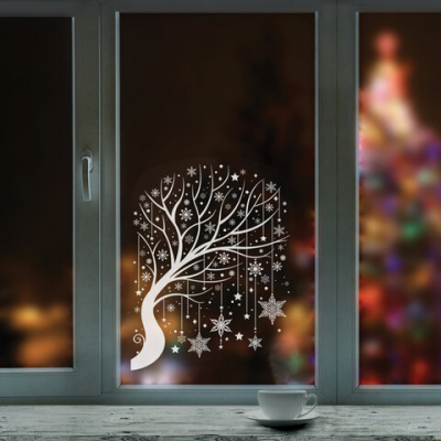 Украшение для окон и стекла ЗОЛОТАЯ СКАЗКА "Дерево в снежинках", 30х38 см, ПВХ, 591199 SAM_591199