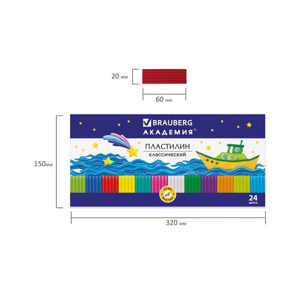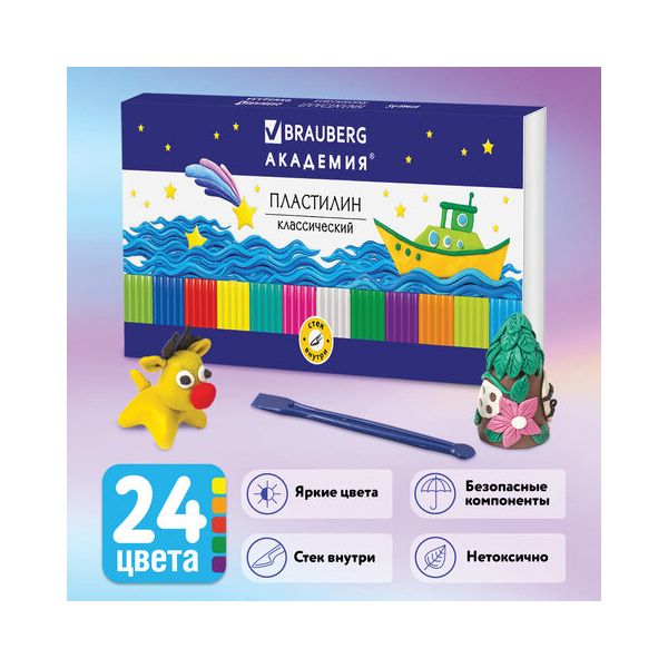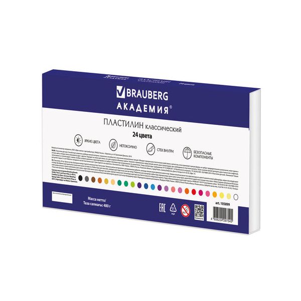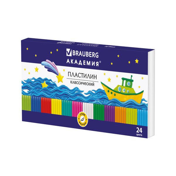 В наличии 360 руб. Пластилин классический BRAUBERG "АКАДЕМИЯ", 24 цвета, 480 г, со ...