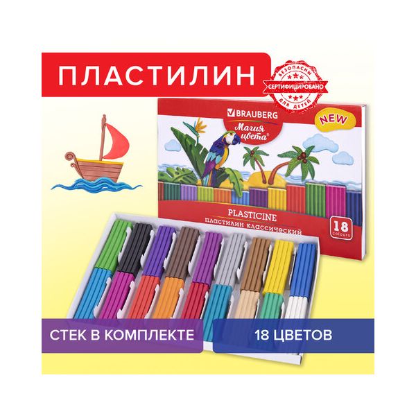 В наличии 140 Р106427, Пластилин классический BRAUBERG МАГИЯ ЦВЕТА NEW, 18 цвет...