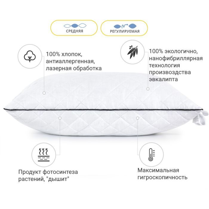Середня — оптимально розрахована вага наповнювача для досягнення гарних показників за пружністю. Ця висота прекрасно підійде людям, які люблять середні, у міру пружні подушки. Подушку можна віднести до розряду стандартних, середніх за м'якістю та висотою. Також не хочеться втратити можливість підкреслити величезний плюс подушок — вони регульовані! Вся принадність у тому, що в подушці є вбудована блискавка (вона розмішена збоку подушки), завдяки якій ви в будь-який момент зможете вийняти трохи наповнювача та підлаштувати подушку повністю під себе.