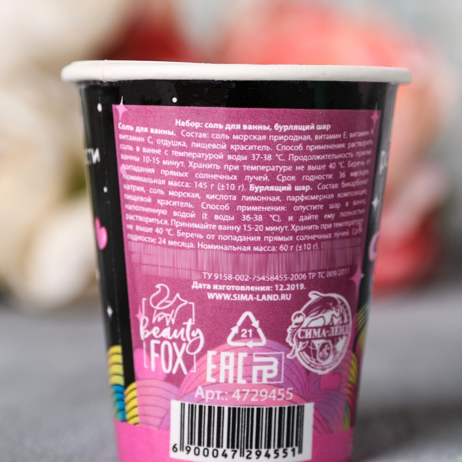 Состав: бикарбонат натрия, соль морская, кислота лимонная, парфюмерная композиция, пищевой краситель.