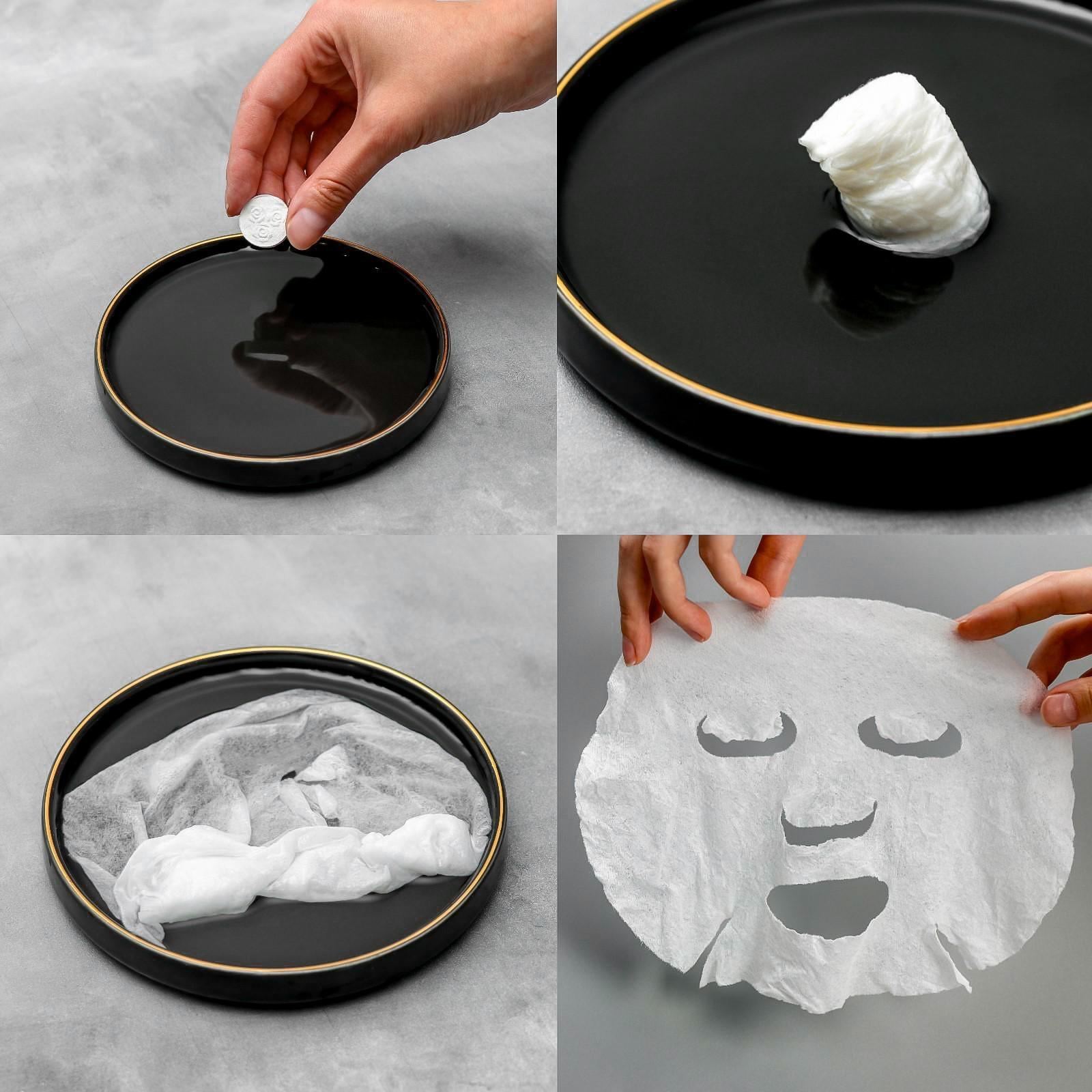 Способ применения: поместите маску-таблетку в небольшую емкость, добавьте желаемое средство, дайте жидкости впитаться. Аккуратно разверните маску, распределите и плотно прижмите к лицу. Оставьте на 10-15 минут, затем удалите с поверхности кожи.