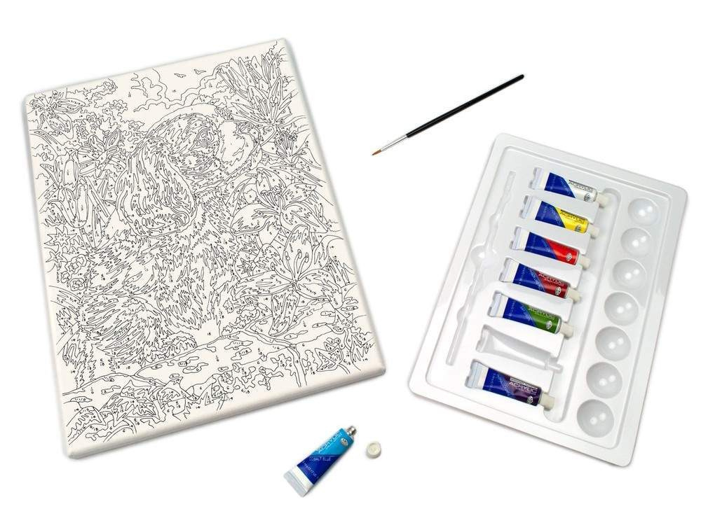 - Состав комплекта Холст на подрамнике, Набор красок, Кисть, Пробный лист с рисунком, Настенное крепление для картины