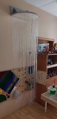 Влагостойкое волокно закреплено на полукруглом основании. Управление источником света осуществляется при помощи пульта ДУ. Предусмотрены режимы статики и плавной смены цветов.