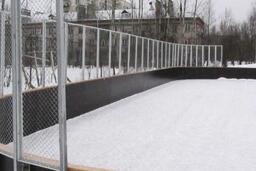 Секции хоккейной площадки различаются по размеру (4 типа размеров). Конструкция соединяется при помощи болтов и сварки. На участках за воротами вдоль периметра устанавливаются элементы из сетки-рабица.