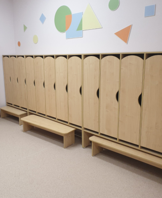 Детский шкаф для одежды безопасный и компактный, вместо ручек вырезы, под шкафчик может задвигаться скамейка для экономии места. В каждом отделении 2 металлических крючка и 2 полки (вверху и внизу). Дверца закруглена в верхней части для лучшего проветривания.