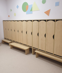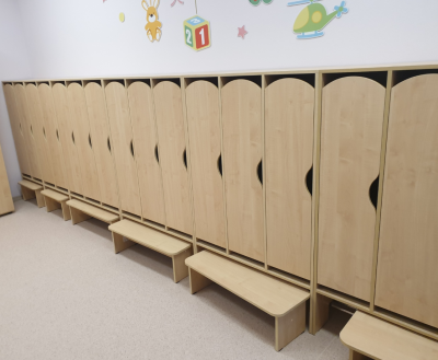 Детский шкаф для одежды безопасный и компактный, вместо ручек вырезы, под шкафчик может задвигаться скамейка для экономии места. В каждом отделении 2 металлических крючка и 2 полки (вверху и внизу). Дверца закруглена в верхней части для лучшего проветривания.