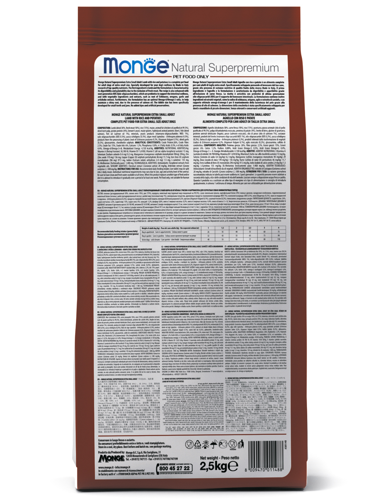 document.addEventListener("DOMContentLoaded", function(event) { $(".hidjedavideo").on("click", function(){ $(this).replaceWith('<div class="responsive-embed widescreen text-center"><iframe height="315" width="100%" src="'+$(this).data("url")+'?autoplay=1&rel=0&loop=1&showinfo=0" frameborder="0" allowfullscreen></iframe></div>'); }); }); Monge (Монж/Монже) Dog Monoprotein (Монопротеин) Mini корм для щенков мелких пород с ягненком и рисом 2,5 кгПолнорационный корм на основе ягненка с рисом. Предназначен для щенков и молодых собак мелких пород до 10 кг в возрасте до одного года.Ягненок и рис являются источниками легкоусваиваемых белков и углеводов, поэтому данный рацион прекрасно подходит собакам с проблемами пищеварения.Содержание X.O.S. помогает сохранить естественный баланс кишечной микрофлоры, способствует оптимальному усвоению питательных веществ и повышает иммунитет.Комплекс лечебных трав и растений благотворно влияет на растущий организм щенка. Богат биологически активными веществами и антиоксидантами, которые способствуют усилению защитных сил организма животного.СоставПитательная ценность: сырой белок: 28%, сырая клетчатка: 2%, сырой жир: 18%, сырая зола: 6,5%, кальций: 1,6%, фосфор: 1,1%, кальций/фосфор = 1,4, омега-3 жирные кислоты: 0,5%, омега-6 жирные кислоты: 3,3%. Энергетическая ценность: 4 240 ккал/кг.Добавки/кг: витамин A (ретинола ацетат) 30 700 МЕ, витамин D3 1610 МЕ, витамин Е (альфа-токоферола ацетат) 72 мг, селен (селенит натрия 0,4 мг) 0,2 мг, марганец (сульфат марганца моногидрат 90 мг) 29 мг, цинк (оксид цинка 170 мг) 136 мг, медь (сульфат меди [II] пентагидрат 46 мг) 11,7 мг, железо (сульфат железа [II] моногидрат 296 мг) 97,5 мг, йод (йодат кальция безводный 2,4 мг) 1,5 мг, L-карнитин: 135 мг, технически чистый DL-метионин: 1400 мг.Технологические добавки:Антиоксиданты: экстракт токоферолов из растительных масел.ВКУСОВЫЕ добавки:экстракт каштана (Castanea sativa) 20 мг/кг, экстракт артишока (Cynara scolymus L.) 300 мг/кг. Смотрите также: Аксессуары, Ветеринарная аптека, Витамины, добавки, Гигиена, Груминг, косметика, Игрушки, Клетки, вольеры, Лакомства, Лежаки, домики, Миски, контейнеры, автокормушки, Намордники, сворки, ринговки, Одежда, обувь, носочки, Переноски, рюкзаки, Рулетки, Сухие корма, Туалеты, пеленки, Шлейки, поводки, ошейники, для крупных пород, премиум-класса, для взрослых собак, для пожилых собак, 10 кг, 15 кг, с рыбойТеги товара: для мелких пород, для щенков, с ягненком