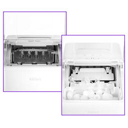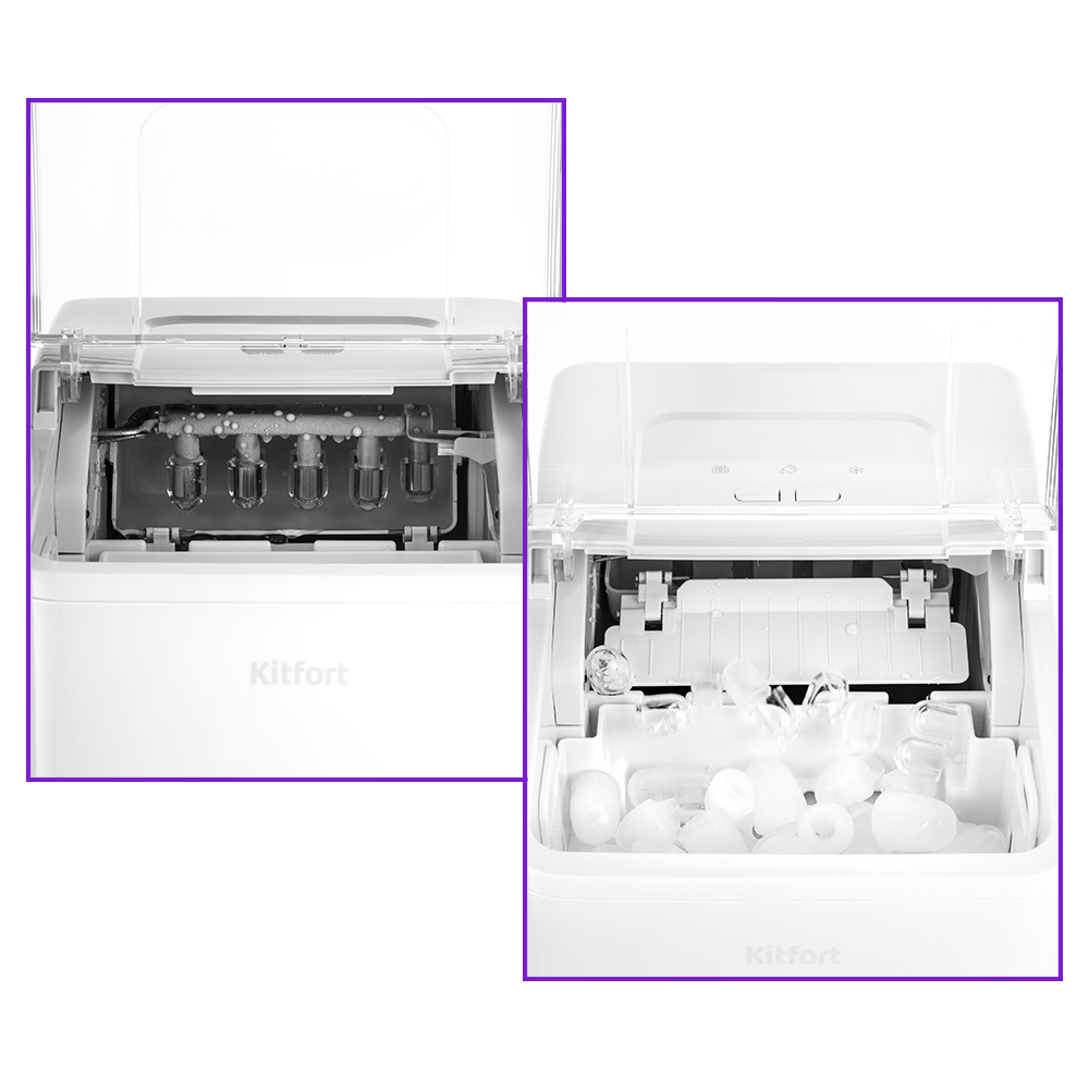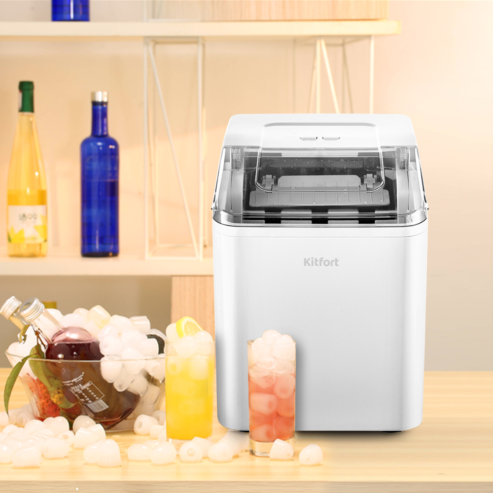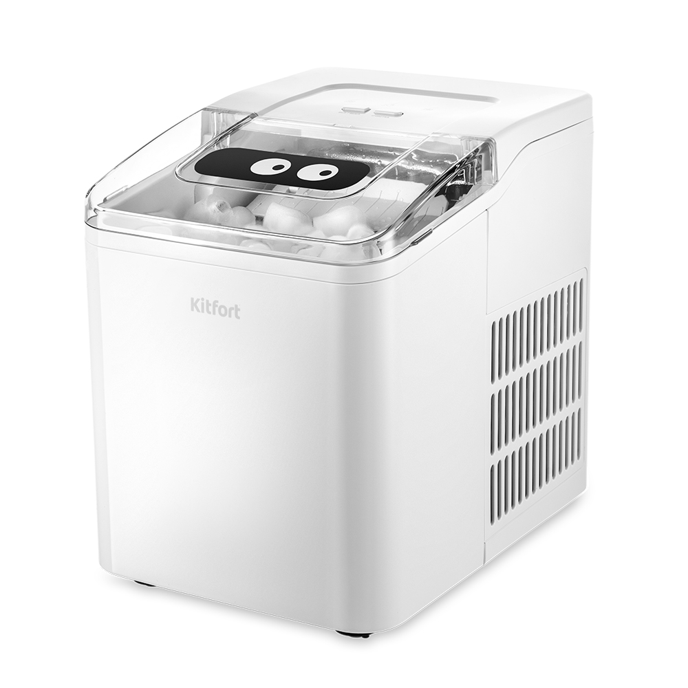 Льдогенератор КТ-1816 прибор, который быстро генерирует лёд. Его можно использовать дома для приготовления охлаждённых напитков или для охлаждения жидкостей. Готовый лёд не подмораживается, а медленно тает благодаря термоизолированным стенкам. Из-за оригинальной технологии приготовления лёд получается в виде напёрстков. Толщина у них небольшая, поэтому лёд легко измельчается блендером. Напёрстки компактно помещаются в стакане, при этом хорошо пропуская жидкость, которую надо охладить. Охлаждение в приборе производится при помощи компрессора с экологически чистым хладагентом R600a по принципу обычного холодильника. Вам нужно просто залить чистую фильтрованную воду в резервуар и нажать кнопку. Остальное льдогенератор сделает сам! После попадания воды в лоток для льда под испарителем, на поверхности испарителя намерзает вода. Когда лёд готов, на него подаётся горячий пар. Он начинает таять и отваливаться от испарителя. Все упавшие кусочки льда отправляются в корзину. Благодаря инфракрасному датчику заполнения корзины, при её переполнении генерация льда автоматически прекращается. В случае, если лёд достали, льдогенератор запускает цикл заново, пока корзина не будет заполнена. В комплекте идёт совок для черпания льда. Индикаторы на панели управления сигнализируют о необходимости добавления воды, о заполнении корзины и о том, генерируется ли в данный момент лёд или прибор находится в режиме ожидания. Кнопка Очистка запускает очистку отсека для приготовления льда. Если в резервуаре осталась вода, её можно легко вылить. Для этого нужно выдвинуть прибор на расстояние 60 мм от стола, подставить ведро или какую-нибудь ёмкость для воды, и вытащить сливную пробку. Наша техника порадует вас не только своим функционалом, но и интересным дизайном! В любой момент вы можете отклеить креативный стикер без вреда для поверхности.