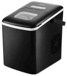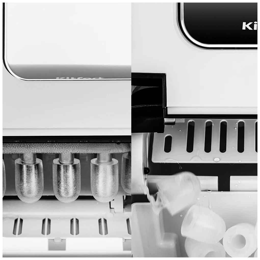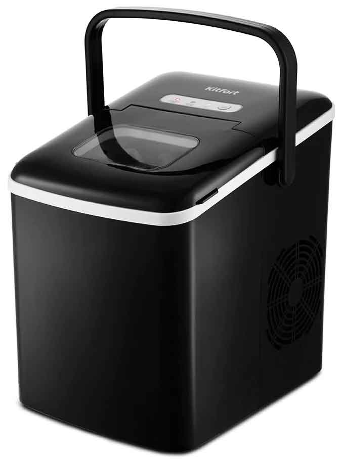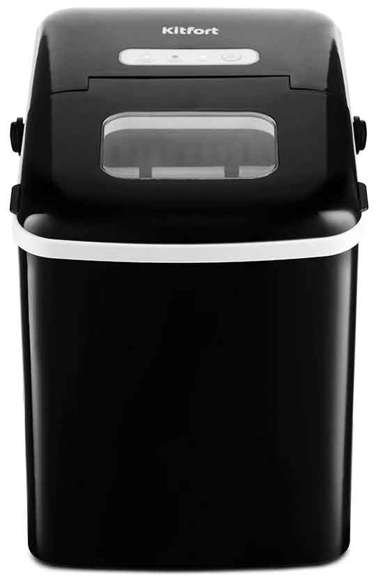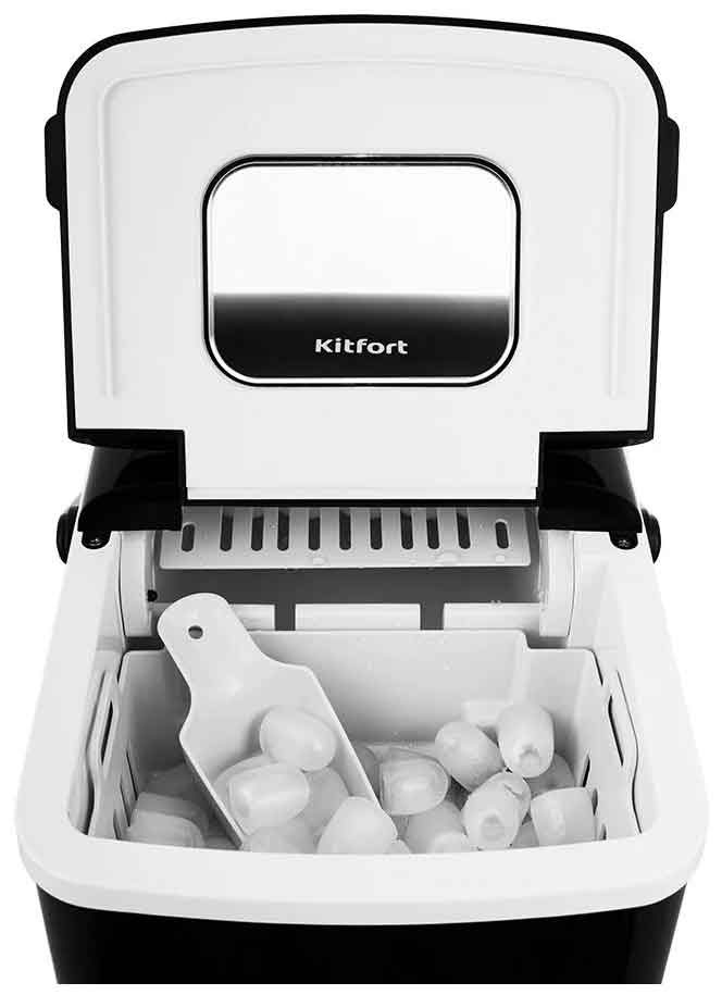 Льдогенератор KITFORT КТ-1806 – прибор, который быстро генерирует лёд. Его можно использовать дома для приготовления охлаждённых напитков или для охлаждения жидкостей. Например, для холодного чая, газированной воды, сока, кофе, коктейлей. Из-за оригинальной технологии приготовления лёд получается в виде напёрстков. Толщина у них небольшая, поэтому лёд легко измельчается блендером. Напёрстки компактно помещаются в стакане, при этом хорошо пропуская жидкость, которую надо охладить. Охлаждение в приборе производится при помощи компрессора с экологически чистым хладагентом R600a по принципу обычного холодильника. Достаточно просто залить чистую фильтрованную воду в резервуар и нажать кнопку. Остальное льдогенератор сделает сам. После попадания воды в лоток для льда под испарителем, на поверхности испарителя намерзает вода. Когда лёд готов, на него подаётся горячий пар. Он начинает таять и отваливаться от испарителя. Все упавшие кусочки льда отправляются в корзину. Благодаря инфракрасному датчику заполнения корзины, при её переполнении генерация льда автоматически прекращается. В случае, если лёд достали, льдогенератор запускает цикл заново, пока корзина не будет заполнена. В комплекте идёт совок для черпания льда. Управление и выбор размера льда осуществляется с помощью кнопок на панели управления. Индикаторы сигнализируют о необходимости добавления воды, о заполнении корзины и о том, генерируется ли в данный момент лёд или прибор находится в режиме ожидания.